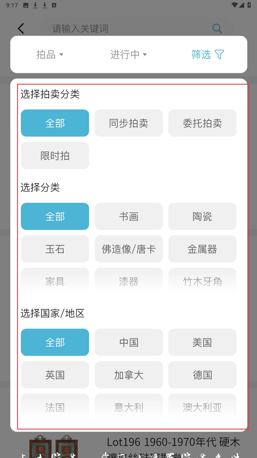 3、点击筛选按钮,在弹出的筛选界面中,选择拍卖分类、分类以及国家/地区。