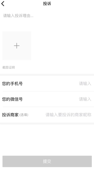 2、请依次填写投诉内容、联系方式以及商家名称,完成后点击提交按钮即可。