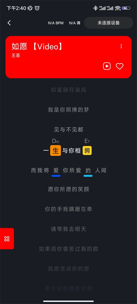 8、还可以在中途时开启鼓机,这时鼓机的预备拍就变成了两拍,所以我们需要提前两拍打开鼓机,比如我们弹唱《如愿》,在副歌前“一生与你相拥”,到这个3级和弦这里就要打开鼓机;