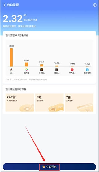2、点击进入自动清理页面后,你可以看到预计清理垃圾的排名情况,页面最下方则是“立即开启”按钮。