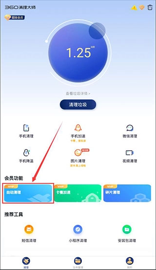1、打开360清理大师的主界面,在界面下方的会员功能区域里,能看到排在首位的功能便是自动清理。