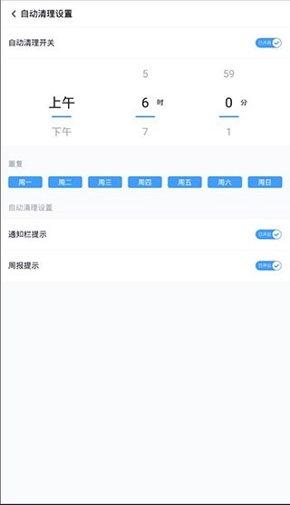 4、在设置页面,你能够对自动清理功能进行开启或关闭操作,还可以设置清理的具体时间、清理的周期,以及开启或关闭相关提示功能。