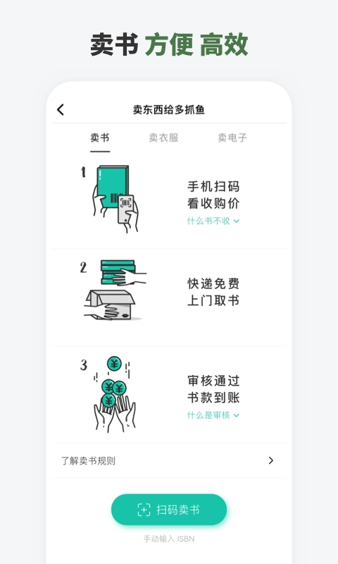 有闲置书籍要处理?在多抓鱼 内直接扫描图书 isbn 码,即时查看书籍收购价。下单后免费上门取书,多抓鱼收到书并审核通过后,即刻打款,方便无负担。