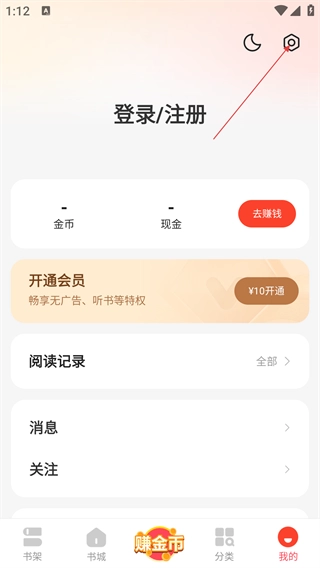 2、在【我的】页面,点击右上角齿轮状【设置】图标,进入设置界面,可进行阅读、青少年模式等多项设置。