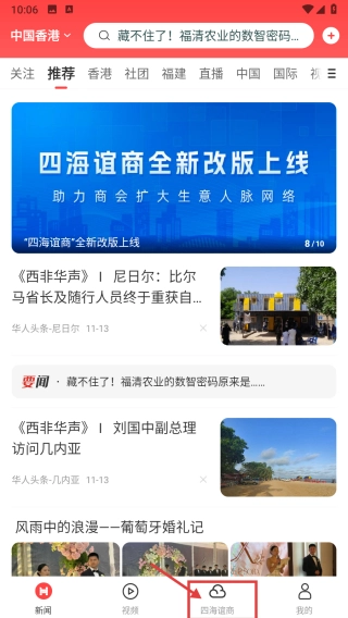 1、打开华人资讯类应用,点击底部的“四海谊商”选项,即可进入商会服务页面。