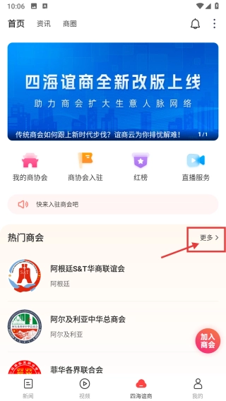 2、在四海谊商页面,点击热门商会区域的更多按钮,查看全部热门商会列表。
