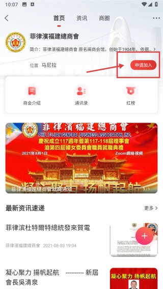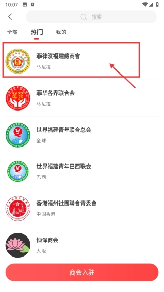 3、在热门商会列表里,选择菲律宾福建總商會条目,进入商会详情页。