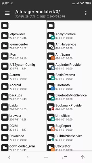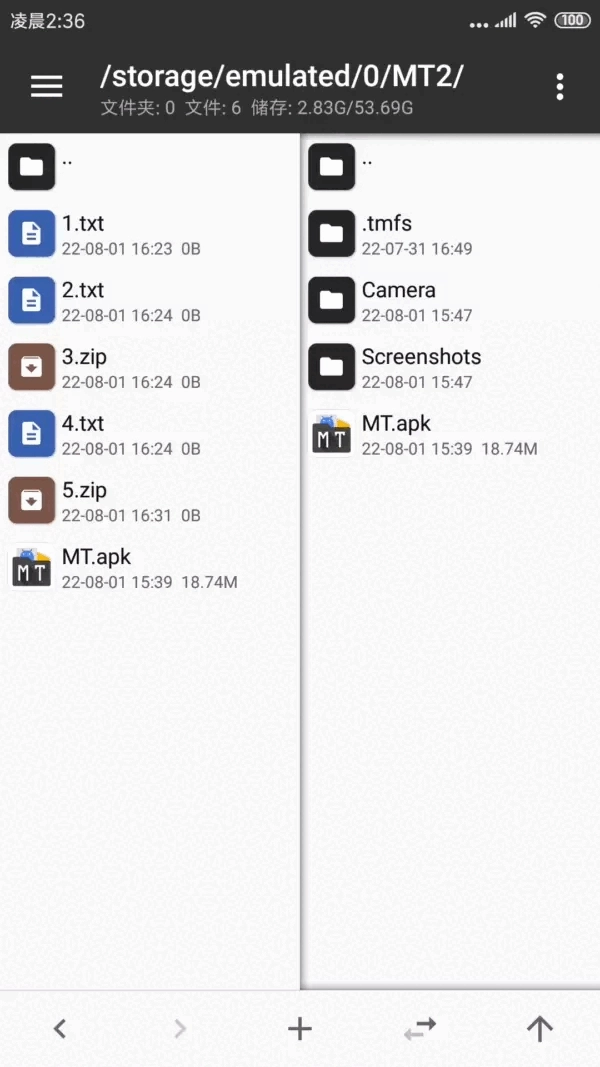 在 MT管理器中,左右两个文件列表窗口允许用户进行高效操作。