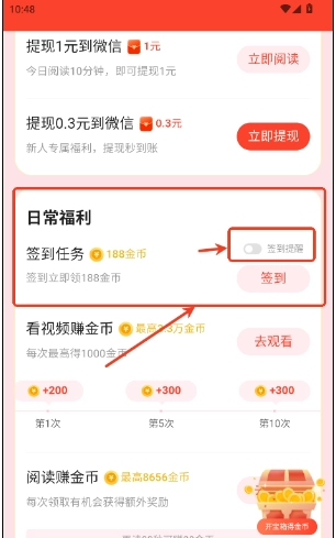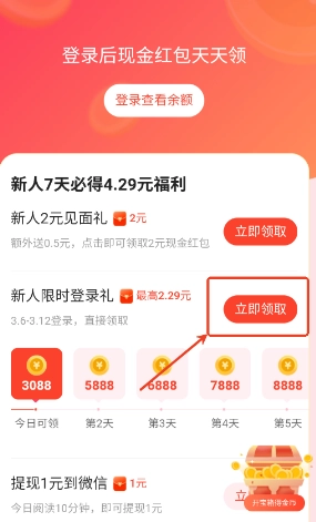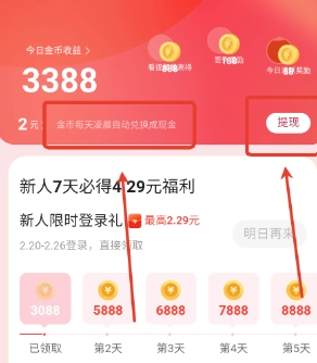 新用户每日登录并完成签到,即可领取金币奖励,若连续签到8天,还将额外获得现金红包。