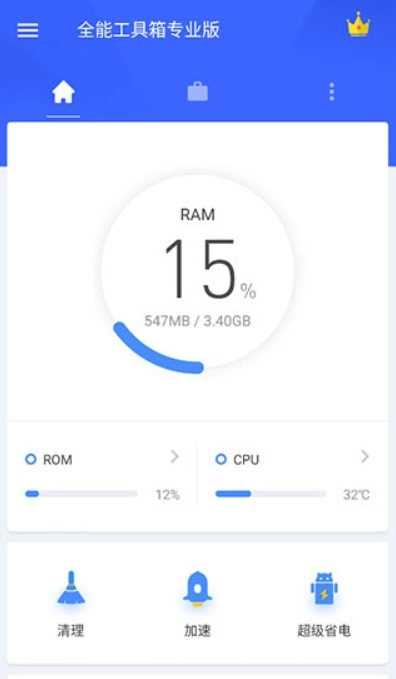 打开全能工具箱专业版后,用户可以在首页快速查看手机的运行状况,包括内存使用情况、CPU温度以及剩余存储空间等。