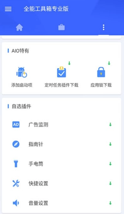 在用户页面,用户能够查看并管理自己所获得的勋章。全能工具箱专业版具备一些独特功能,像添加启动项、定时任务插件以及应用锁等。另外,用户还可以依据自身需求,自主挑选插件来使用,例如广告监测、指南针、手电筒、快捷设置和音量设置等,从而让手机更具个性化。