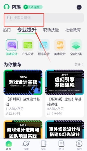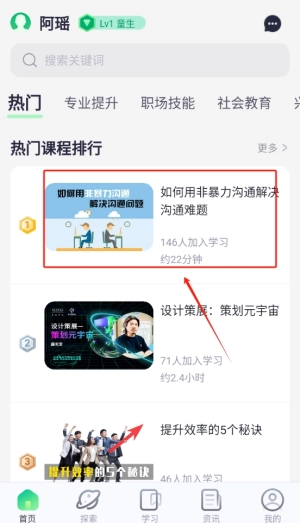 3、利用搜索栏输入关键词,快速找到相关课程,节省查找时间,方便高效。