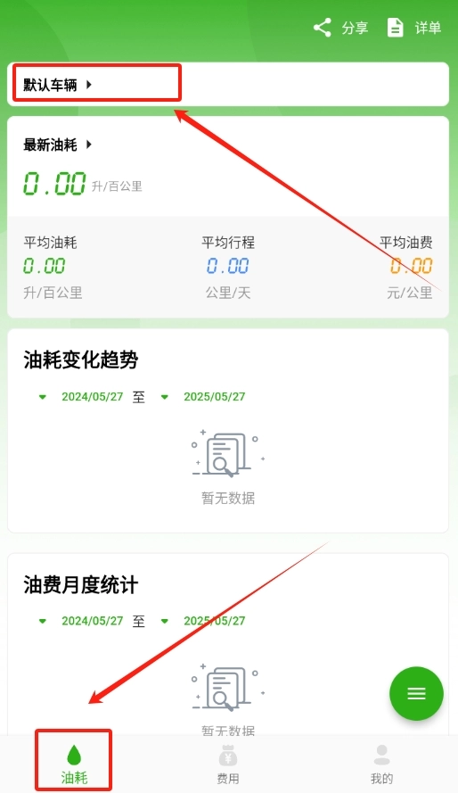 1、汽车记油耗软件成功安装后,轻点打开,在显示的首页中,点击顶部的默认车辆选项。