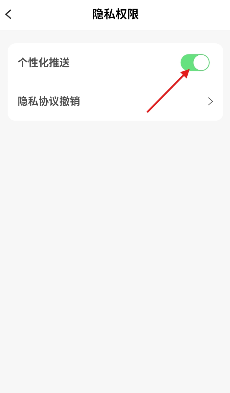 4、在隐私权限页面内,找到 “个性化推荐” 功能项,点击其旁边的开关即可完成关闭操作。