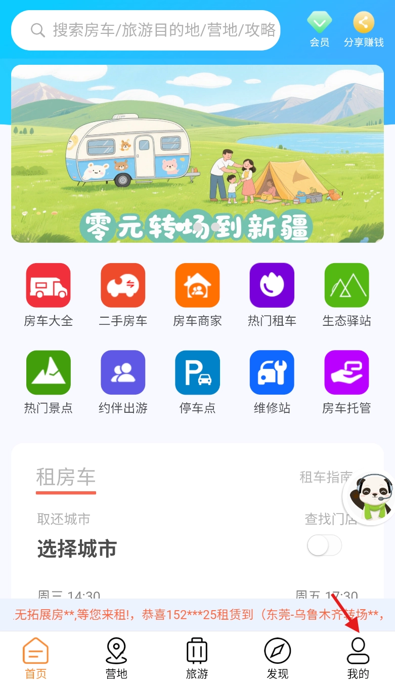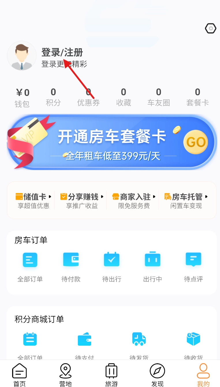 1、打开房车潮惠玩应用,在界面底部找到“我的”选项,轻点该选项进入个人相关页面。