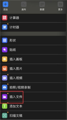 4、在添加中找到 插入文件 ,即可选择word文档导入。