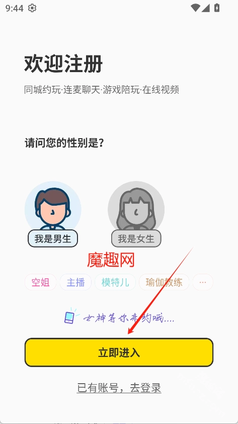 3、选择性别、职业等信息,点击“立即进入”