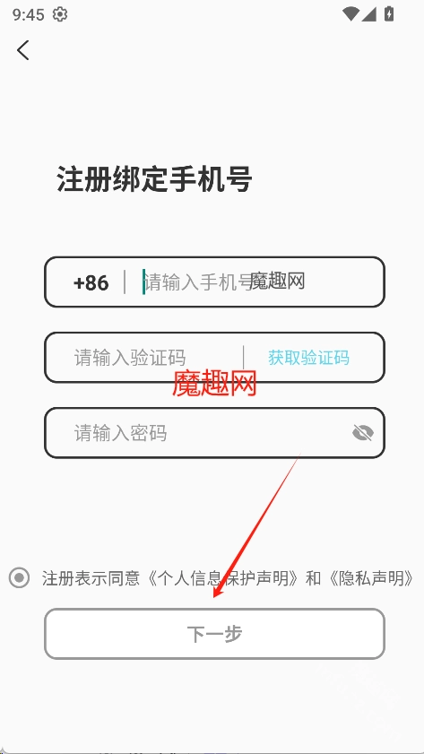 4、输入手机号、验证码,设置密码,点击“下一步”即可完成注册