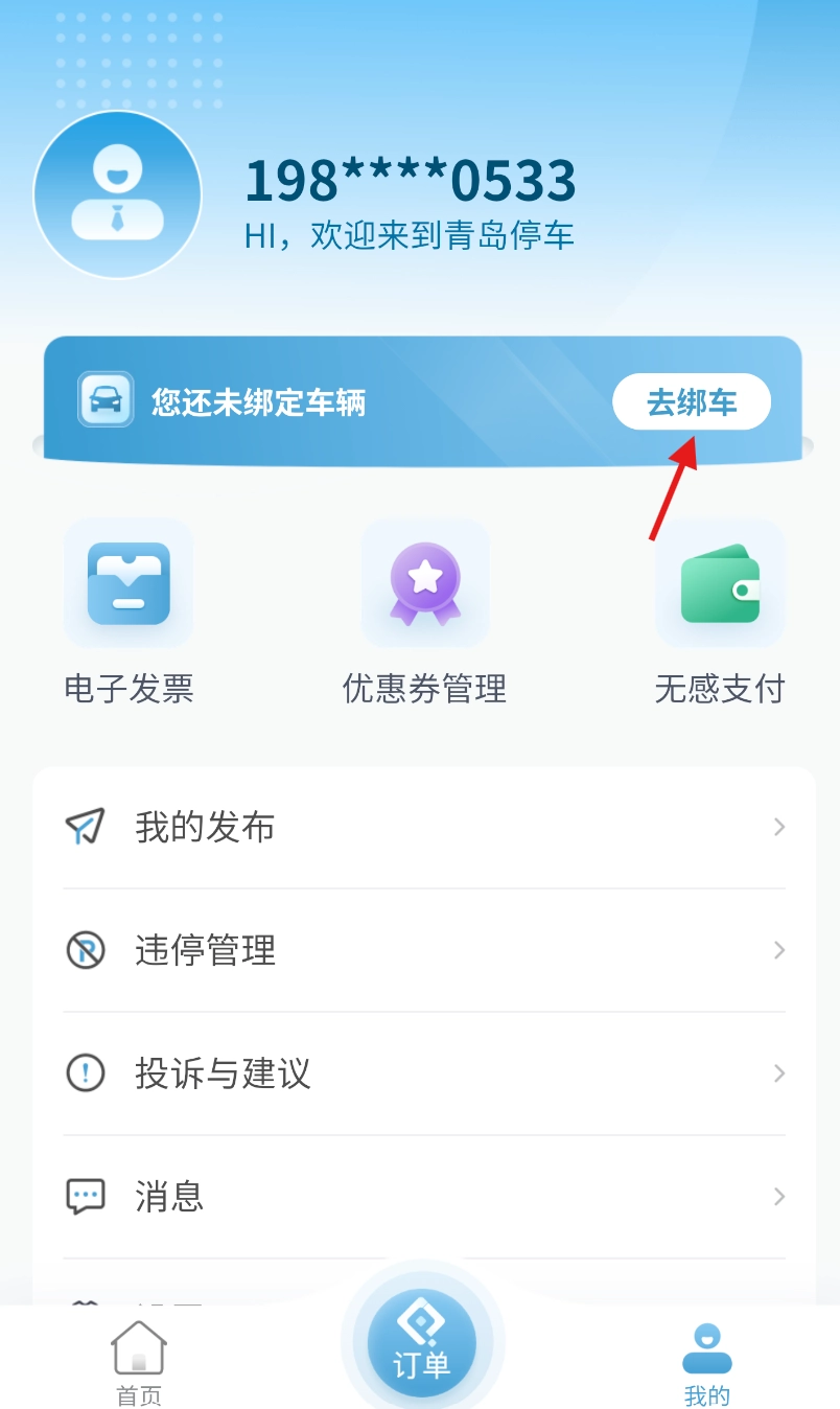 2、于个人页面中,找到 “去绑车” 功能按钮,点击该选项进入车辆绑定操作界面。