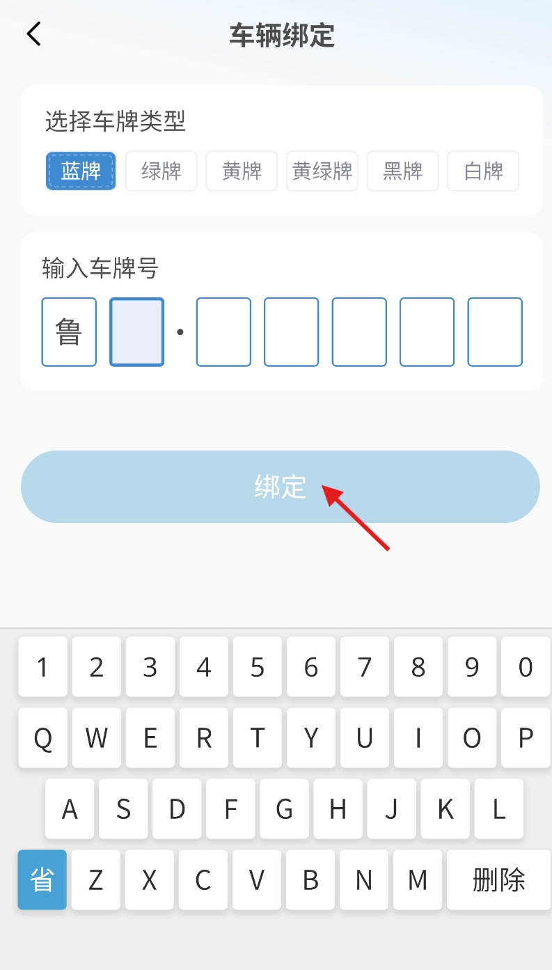 3、在车辆绑定界面,准确输入车牌号信息,确认无误后点击 “绑定” 按钮完成车辆关联 。