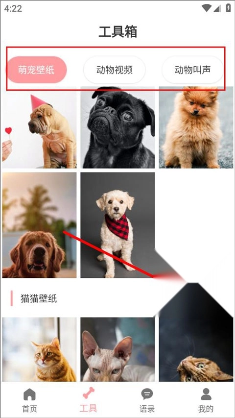 3、打开工具箱页面,可以查找萌宠壁纸、视频以及动物叫声;