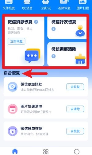 2、点击首页中间“微信消息恢复、微信好友恢复、微信彻底清除”区域,便可进行对应的微信数据管理操作。