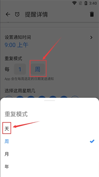 4、在【提醒详情】页,将每1周更换为每1天即可。