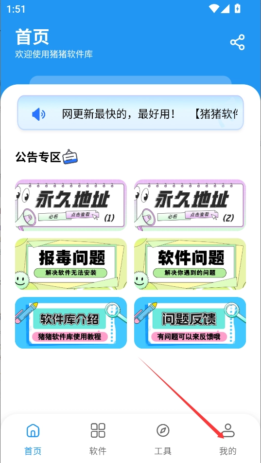 1、猪猪软件库提供了四个板块,首页板块中拥有公告专区,让用户可以查看永久地址,了解软件问题;