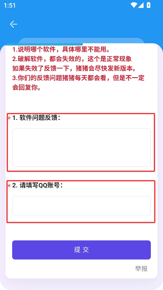 3、填写软件问题反馈和QQ账号在选框里面
