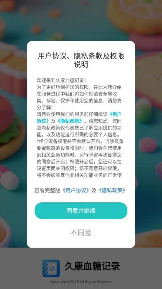 软件安装完成后打开,点击同意弹出的用户协议、隐私条款以及权限说明。