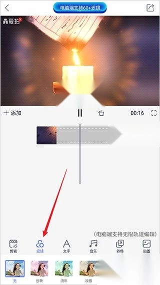 6、点击【滤镜】,可以给视频添加滤镜效果;