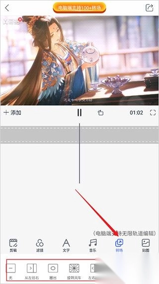 9、点击【转场】,可以对多个视频之间进行转换操作;
