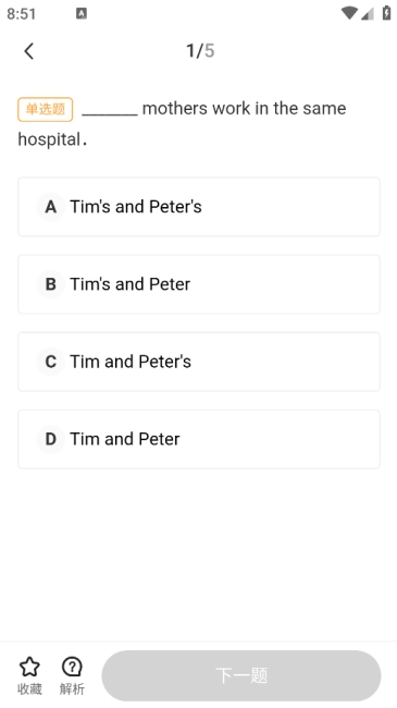 4.点击题库后即可开始练题,此外还提供了收藏和解析功能。