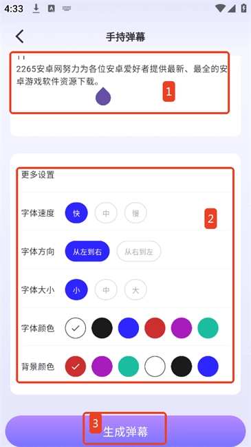 2.输入弹幕内容并进行设置后点击“生成弹幕”