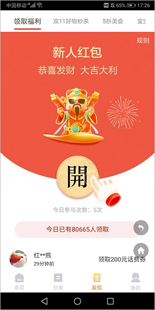 用户进入应用的发现页面后,即可领取新人红包。