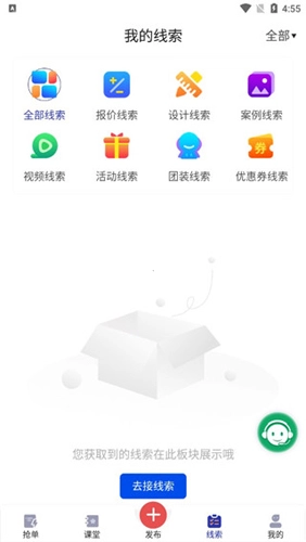 1、进入装修获客宝,在首页中你可以通过预约线索、活动线索、团装线索进行获客;