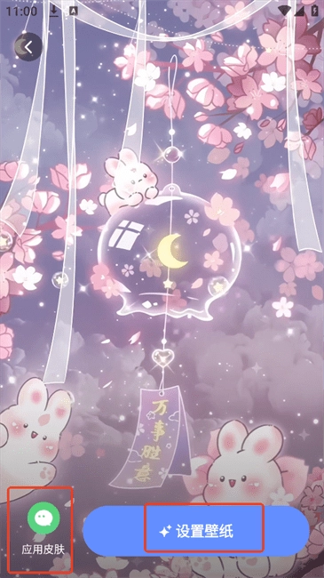 2.“应用皮肤”可以直接把当前主题设置为微信或是QQ背景;点击“设置壁纸”可直接将壁纸应用到手机背景当中