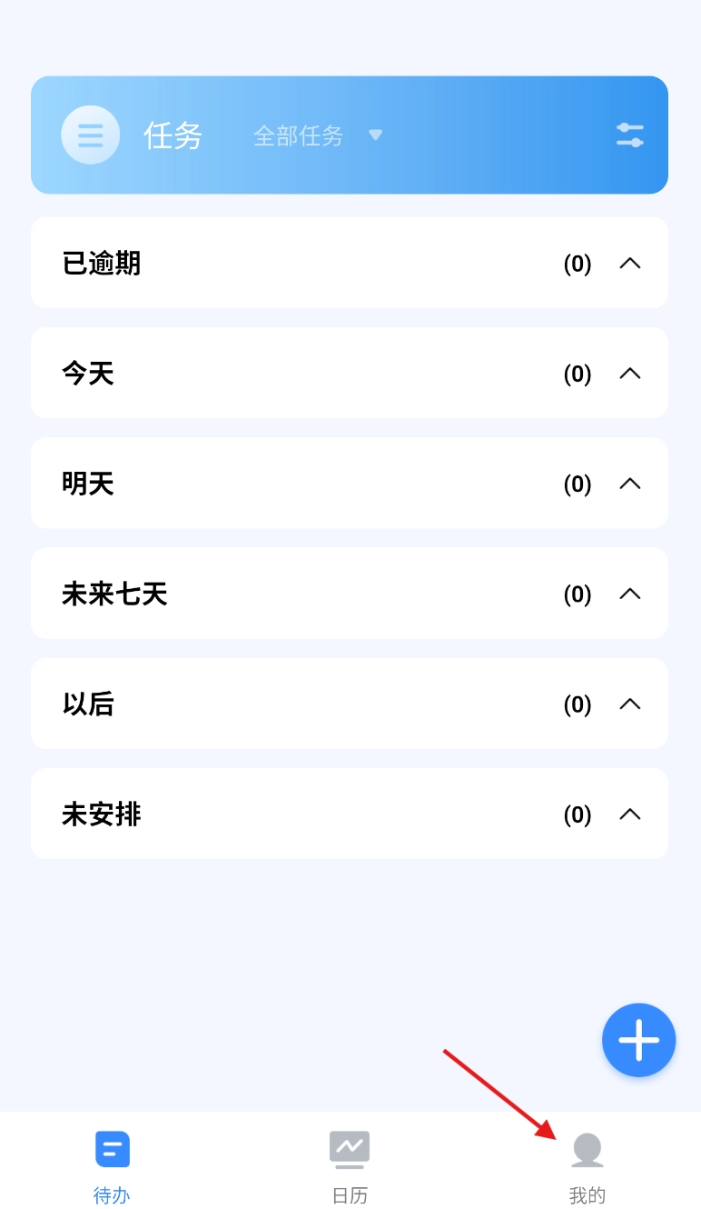 1、打开滴答清单并进入待办页面,接着轻点页面下方的“我的”选项,即可进入个人设置界面。