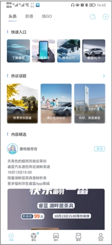 2. 支持用户分享日常生活里的趣闻趣事,在购买睿蓝汽车后,还能进行远程操控车辆,并且可以记录换电的旅程。
