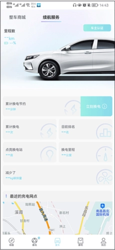 3. 在爱车界面,能够实现一键预约试驾或者直接进行订车操作,订车之后可在续航服务板块享受车联网功能带来的便利,同时还能够查询换电次数、已点亮的换电站等专属信息,也能够查找充电网点为车辆进行换电。
