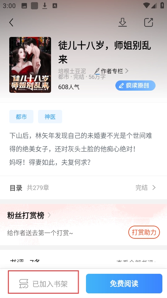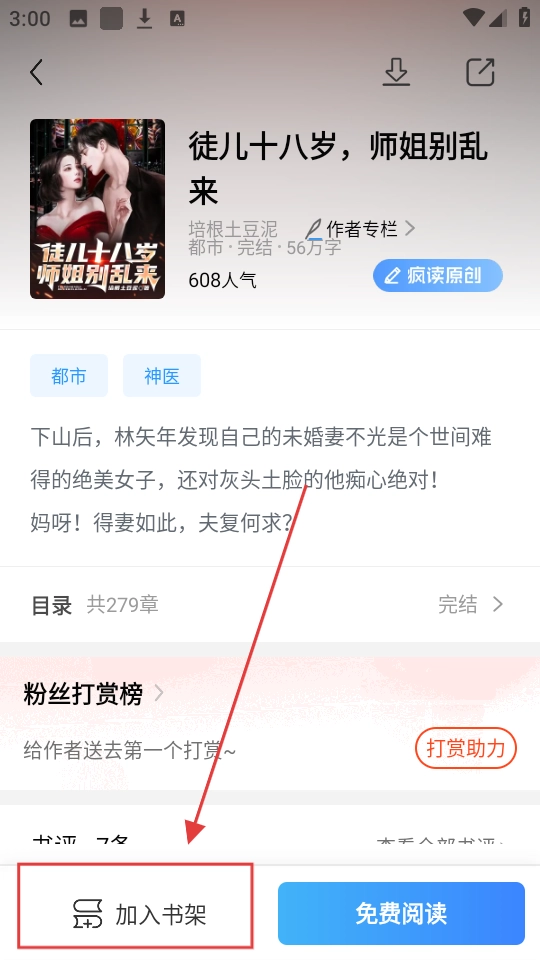 2、进入小说详情,点击【加入书架】,把小说收藏起来,方便以后阅读哦。