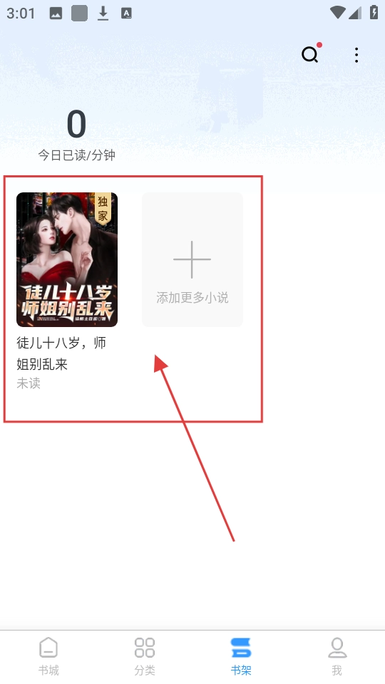 4、回到书架页面,就能看到刚加入的《徒儿十八岁,师姐别乱来》,随时可以阅读咯。