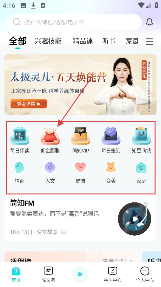 进入软件首页后,能看到不少功能入口。要是想查找情商相关的内容,点击【情商】选项就能浏览对应的内容了。