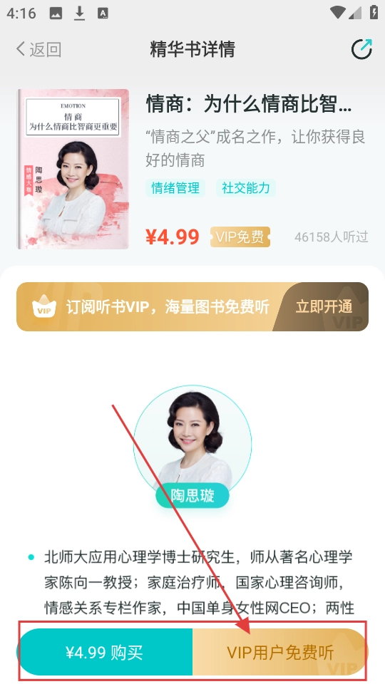 3、进入精华书详情页,若想免费听,就点击【VIP用户免费听】,不过得是VIP才行哦。