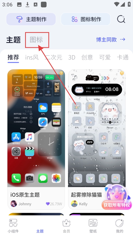 进入主题页面后,找到上方的【图标】选项并点击,即可查看各类图标分类。
