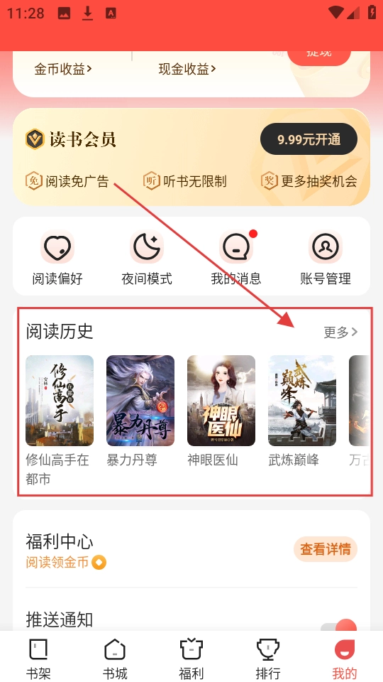 1、进入“我的”页面后,找到【阅读历史】板块,点击板块中的【更多】按钮,就能查看完整的阅读历史列表啦。