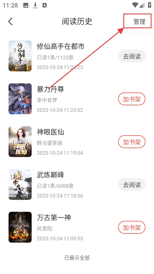 2、进入阅读历史列表后,点击右上角【管理】按钮,可进入批量管理模式,对阅读历史进行操作啦。