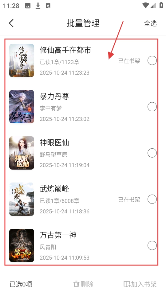 3、在批量管理模式下,可选择要操作的阅读记录,如勾选【修仙高手在都市】等小说记录哦。