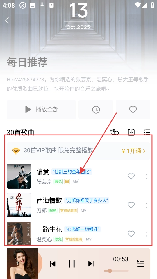 1、每日推荐页面有30首歌曲,像【偏爱】就很经典,快点击喜欢的歌曲吧。