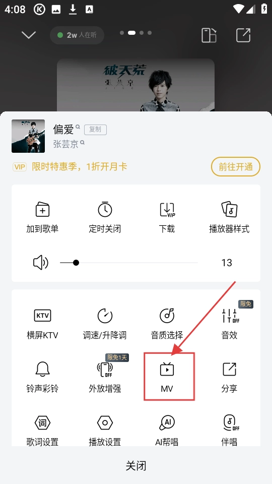 3、展开功能选项后,能看到很多功能,点击【MV】,就可以观看歌曲的MV啦。